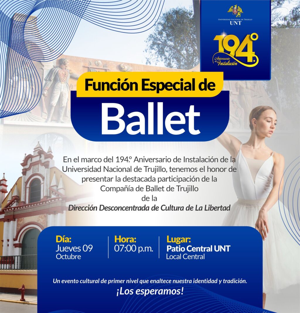 Con motivo del 194.º aniversario de la fundación de la Universidad Nacional de Trujillo, invitamos a la comunidad universitaria a la función especial de la Compañía de Ballet de Trujillo y la Dirección Desconcentrada de Cultura de La Libertad.